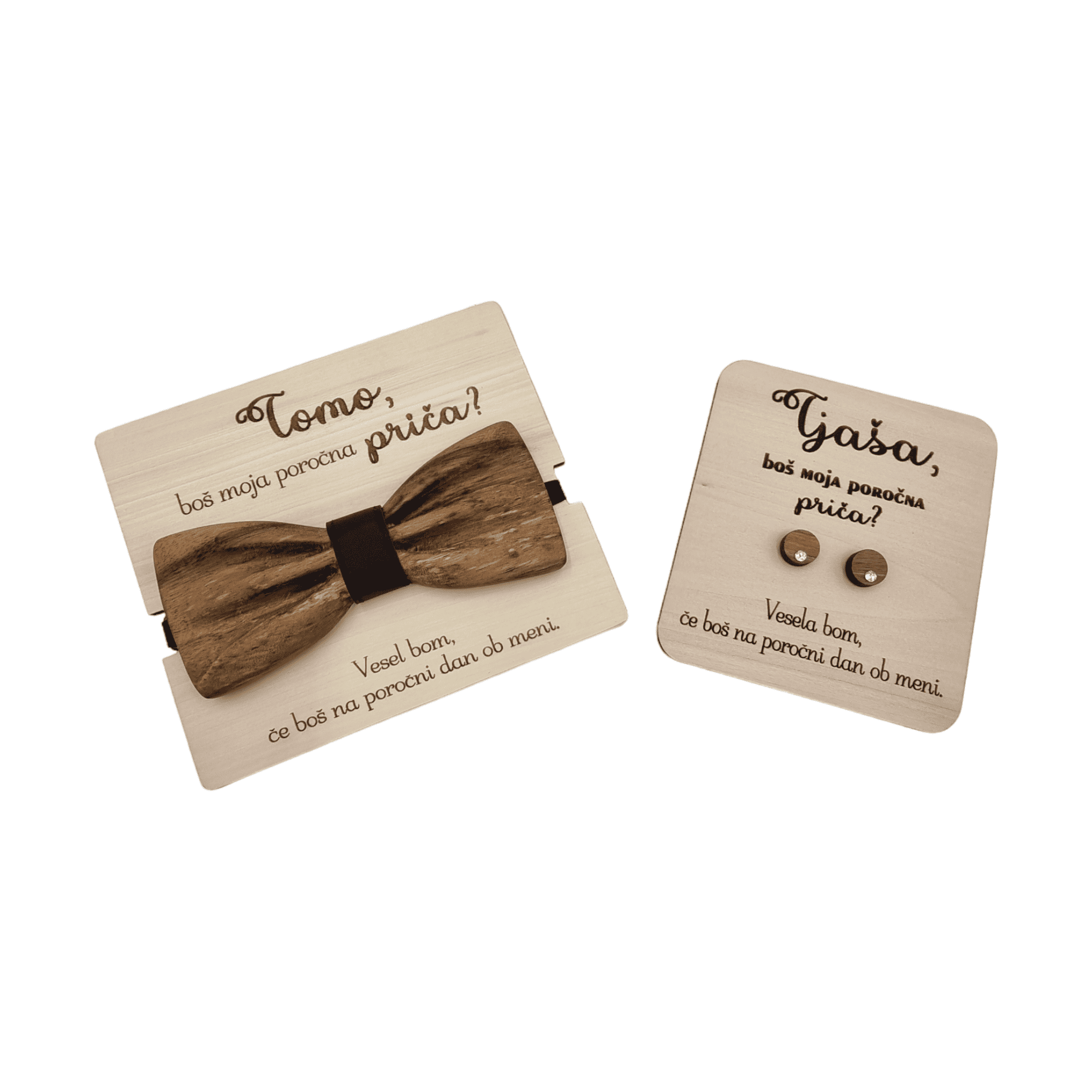 • Unikaten komplet lesenih uhanov z dodatkom kristalov Swarovski, s personaliziranim vprašanjem za bodočo pričo.