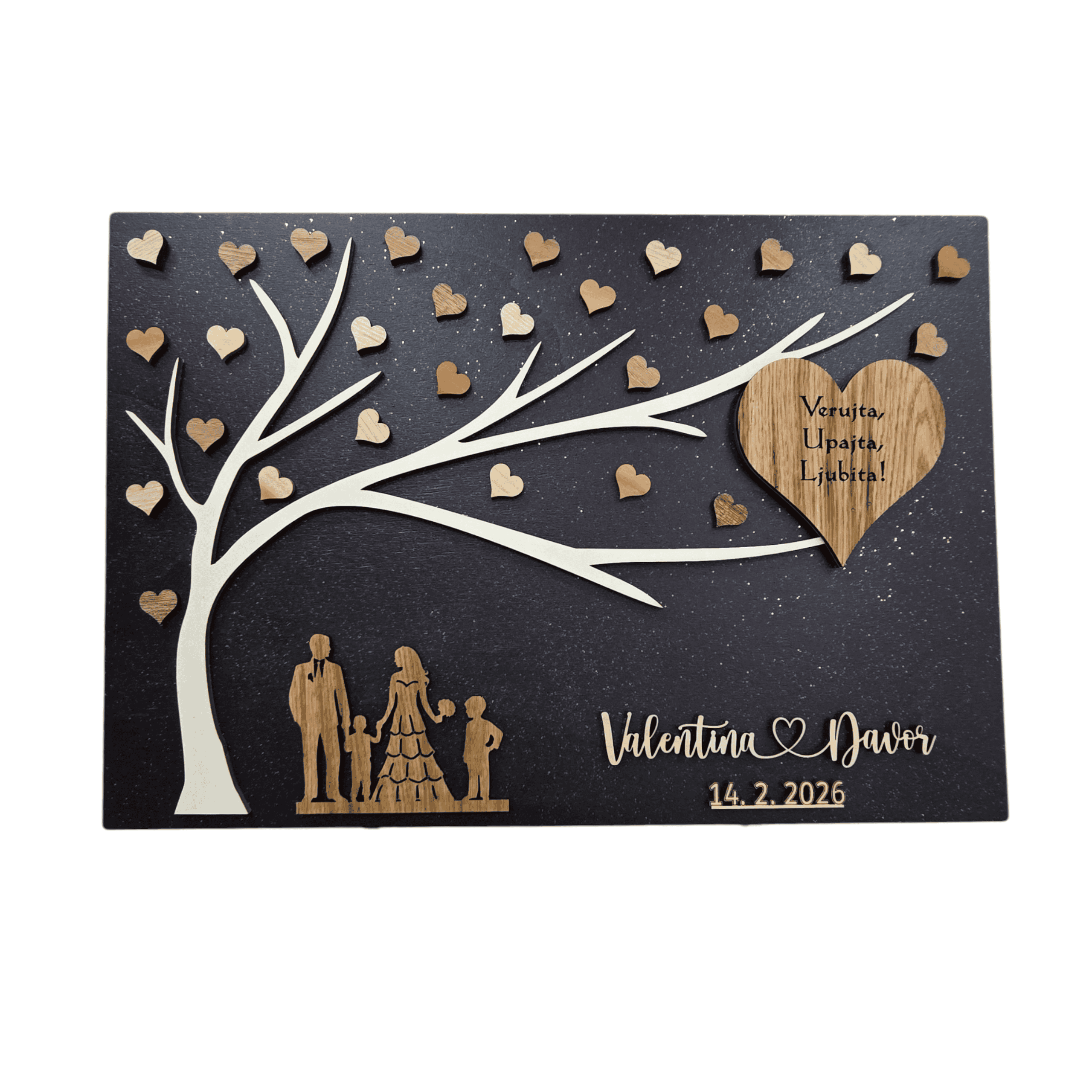 Poročna okrasna tabla je čudovit spomin na najlepši dan v življenju. S svojo barvitostjo bo lepo popestrila steno ali prostor doma mladoporočencev.